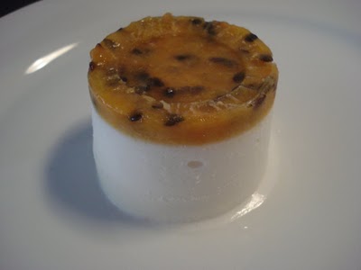 Hidrate a gelatina na água e dissolva em banho-maria. Junte duas chávenas de sumo à base de maracujá e duas colheres (sopa) do côco ralado. Distribua pelas taças e leve ao frigorífico (congelador) durante três horas (no mínimo).